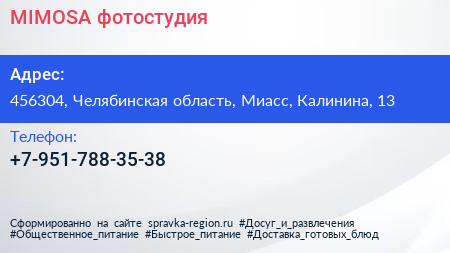 MIMOSA, фотостудия по адресу 456304, Челябинская область, Миасс, Калинина, 13 в дальнейшем Организация, размещена в следующих категориях: