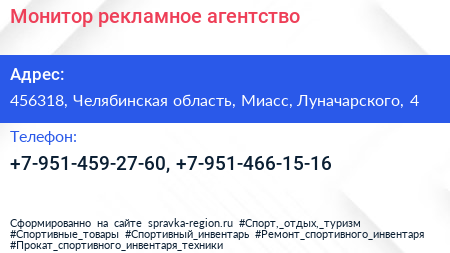 Монитор, рекламное агентство по адресу 456318, Челябинская область, Миасс, Луначарского, 4 в дальнейшем Организация, размещена в следующих категориях: