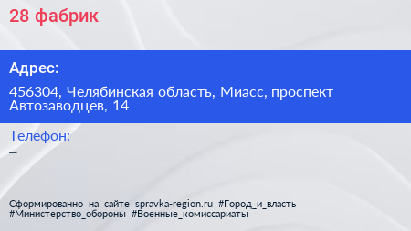 28 фабрик по адресу 456304, Челябинская область, Миасс, проспект Автозаводцев, 14 в дальнейшем Организация, размещена в следующих категориях: