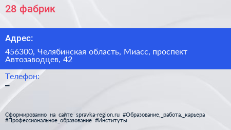 28 фабрик по адресу 456300, Челябинская область, Миасс, проспект Автозаводцев, 42 в дальнейшем Организация, размещена в следующих категориях: