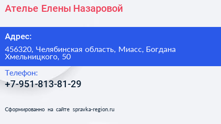 Ателье Елены Назаровой по адресу 456320, Челябинская область, Миасс, Богдана Хмельницкого, 50 в дальнейшем Организация, размещена в следующих категориях: