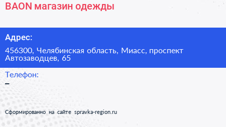 BAON, магазин одежды по адресу 456300, Челябинская область, Миасс, проспект Автозаводцев, 65 в дальнейшем Организация, размещена в следующих категориях: