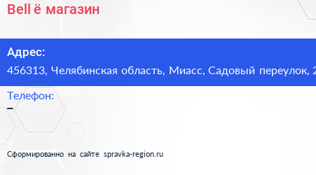 Bell`ё, магазин по адресу 456313, Челябинская область, Миасс, Садовый переулок, 2 в дальнейшем Организация, размещена в следующих категориях: