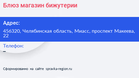 Блюз, магазин бижутерии по адресу 456320, Челябинская область, Миасс, проспект Макеева, 22 в дальнейшем Организация, размещена в следующих категориях:
