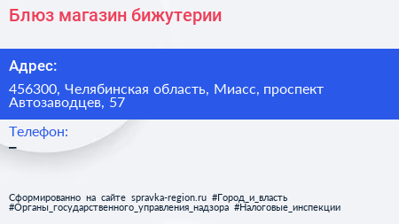 Блюз, магазин бижутерии по адресу 456300, Челябинская область, Миасс, проспект Автозаводцев, 57 в дальнейшем Организация, размещена в следующих категориях: