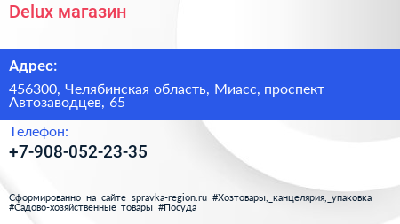 Delux, магазин по адресу 456300, Челябинская область, Миасс, проспект Автозаводцев, 65 в дальнейшем Организация, размещена в следующих категориях: