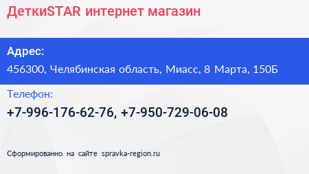 ДеткиSTAR, интернет-магазин по адресу 456300, Челябинская область, Миасс, 8 Марта, 150Б в дальнейшем Организация, размещена в следующих категориях: