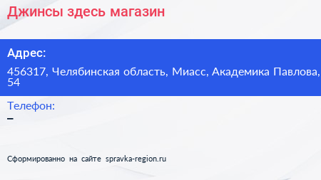 Джинсы здесь, магазин по адресу 456317, Челябинская область, Миасс, Академика Павлова, 54 в дальнейшем Организация, размещена в следующих категориях: