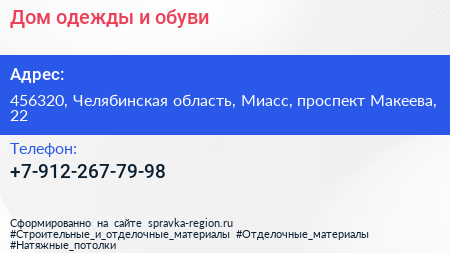 Дом одежды и обуви по адресу 456320, Челябинская область, Миасс, проспект Макеева, 22 в дальнейшем Организация, размещена в следующих категориях: