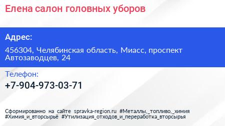 Елена, салон головных уборов по адресу 456304, Челябинская область, Миасс, проспект Автозаводцев, 24 в дальнейшем Организация, размещена в следующих категориях: