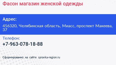 Фасон, магазин женской одежды по адресу 456320, Челябинская область, Миасс, проспект Макеева, 37 в дальнейшем Организация, размещена в следующих категориях: