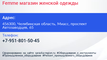 Femme, магазин женской одежды по адресу 456300, Челябинская область, Миасс, проспект Автозаводцев, 65 в дальнейшем Организация, размещена в следующих категориях:
