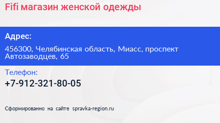 Fifi, магазин женской одежды по адресу 456300, Челябинская область, Миасс, проспект Автозаводцев, 65 в дальнейшем Организация, размещена в следующих категориях: