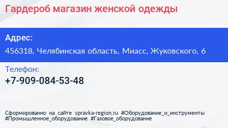 Гардероб, магазин женской одежды по адресу 456318, Челябинская область, Миасс, Жуковского, 6 в дальнейшем Организация, размещена в следующих категориях:
