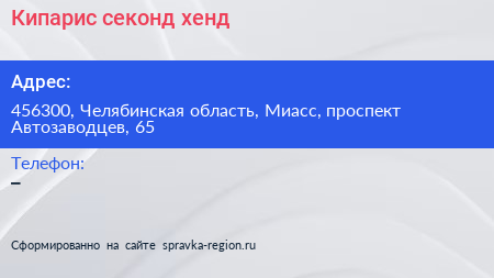 Кипарис, секонд-хенд по адресу 456300, Челябинская область, Миасс, проспект Автозаводцев, 65 в дальнейшем Организация, размещена в следующих категориях: