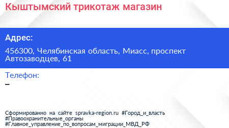 Кыштымский трикотаж, магазин по адресу 456300, Челябинская область, Миасс, проспект Автозаводцев, 61 в дальнейшем Организация, размещена в следующих категориях: