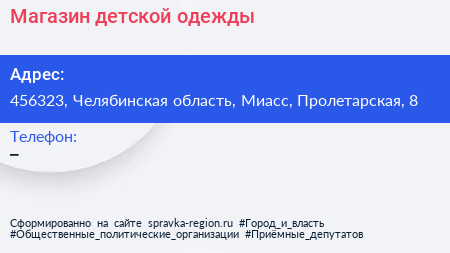 Магазин детской одежды по адресу 456323, Челябинская область, Миасс, Пролетарская, 8 в дальнейшем Организация, размещена в следующих категориях: