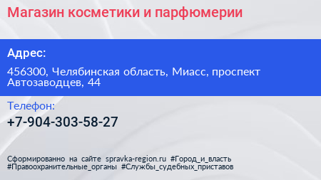 Магазин косметики и парфюмерии по адресу 456300, Челябинская область, Миасс, проспект Автозаводцев, 44 в дальнейшем Организация, размещена в следующих категориях: