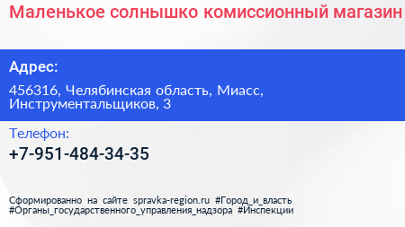 Маленькое солнышко, комиссионный магазин по адресу 456316, Челябинская область, Миасс, Инструментальщиков, 3 в дальнейшем Организация, размещена в следующих категориях: