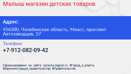 Малыш, магазин детских товаров по адресу 456300, Челябинская область, Миасс, проспект Автозаводцев, 57 в дальнейшем Организация, размещена в следующих категориях: