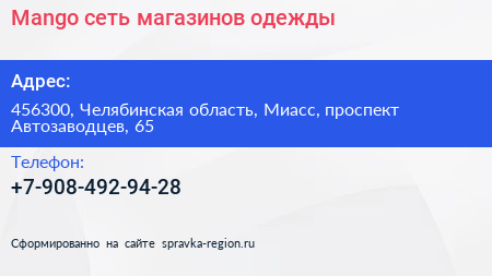 Mango, сеть магазинов одежды по адресу 456300, Челябинская область, Миасс, проспект Автозаводцев, 65 в дальнейшем Организация, размещена в следующих категориях: