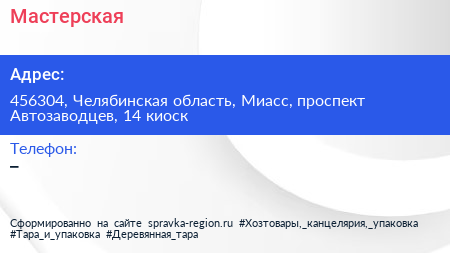 Мастерская по адресу 456304, Челябинская область, Миасс, проспект Автозаводцев, 14 киоск в дальнейшем Организация, размещена в следующих категориях: