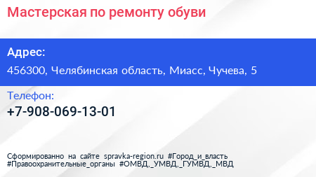 Мастерская по ремонту обуви по адресу 456300, Челябинская область, Миасс, Чучева, 5 в дальнейшем Организация, размещена в следующих категориях:
