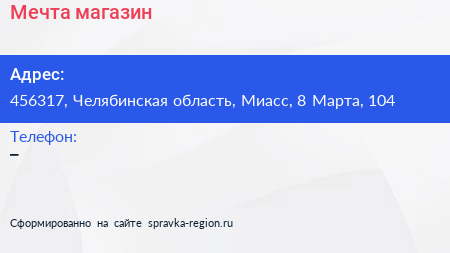 Мечта, магазин по адресу 456317, Челябинская область, Миасс, 8 Марта, 104 в дальнейшем Организация, размещена в следующих категориях:
