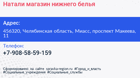 Натали, магазин нижнего белья по адресу 456320, Челябинская область, Миасс, проспект Макеева, 11 в дальнейшем Организация, размещена в следующих категориях: