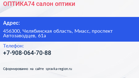 ОПТИКА74, салон оптики по адресу 456300, Челябинская область, Миасс, проспект Автозаводцев, 61а в дальнейшем Организация, размещена в следующих категориях: