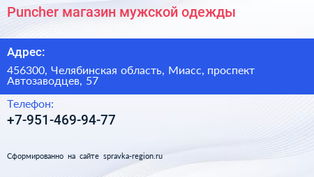 Puncher, магазин мужской одежды по адресу 456300, Челябинская область, Миасс, проспект Автозаводцев, 57 в дальнейшем Организация, размещена в следующих категориях: