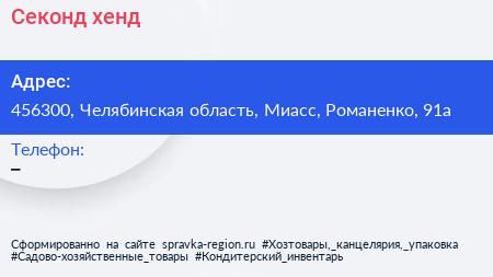 Секонд-хенд по адресу 456300, Челябинская область, Миасс, Романенко, 91а в дальнейшем Организация, размещена в следующих категориях: