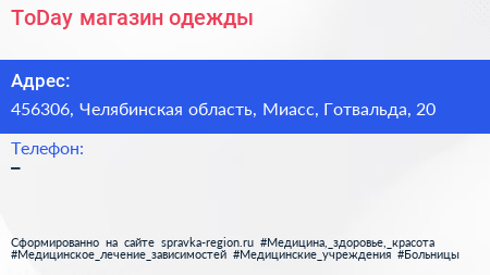 ToDay, магазин одежды по адресу 456306, Челябинская область, Миасс, Готвальда, 20 в дальнейшем Организация, размещена в следующих категориях: