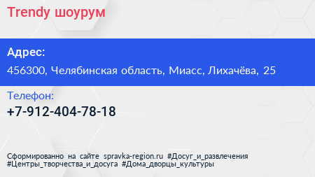 Trendy, шоурум по адресу 456300, Челябинская область, Миасс, Лихачёва, 25 в дальнейшем Организация, размещена в следующих категориях: