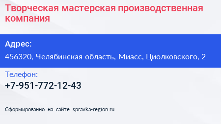 Творческая мастерская, производственная компания по адресу 456320, Челябинская область, Миасс, Циолковского, 2 в дальнейшем Организация, размещена в следующих категориях: