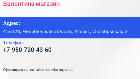 Валентина, магазин по адресу 456323, Челябинская область, Миасс, Октябрьская, 2 в дальнейшем Организация, размещена в следующих категориях: