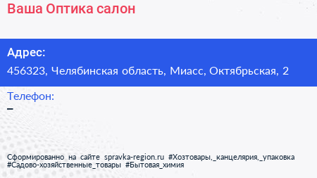 Ваша Оптика, салон по адресу 456323, Челябинская область, Миасс, Октябрьская, 2 в дальнейшем Организация, размещена в следующих категориях: