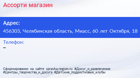 Ассорти, магазин по адресу 456303, Челябинская область, Миасс, 60 лет Октября, 18 в дальнейшем Организация, размещена в следующих категориях: