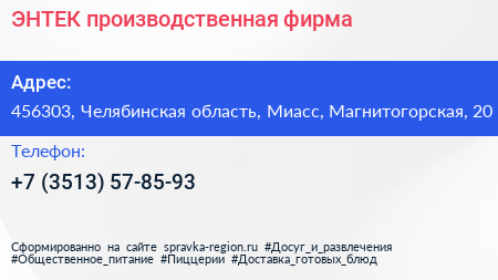 ЭНТЕК, производственная фирма по адресу 456303, Челябинская область, Миасс, Магнитогорская, 20 в дальнейшем Организация, размещена в следующих категориях: