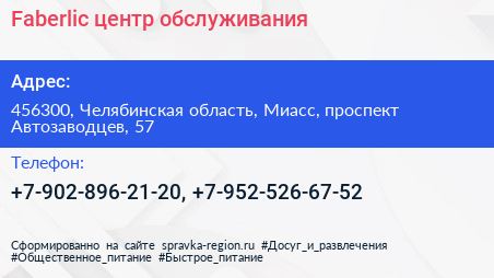 Faberlic, центр обслуживания по адресу 456300, Челябинская область, Миасс, проспект Автозаводцев, 57 в дальнейшем Организация, размещена в следующих категориях: