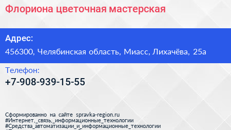 Флориона, цветочная мастерская по адресу 456300, Челябинская область, Миасс, Лихачёва, 25а в дальнейшем Организация, размещена в следующих категориях: