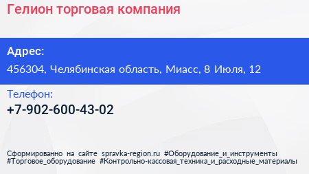 Гелион, торговая компания по адресу 456304, Челябинская область, Миасс, 8 Июля, 12 в дальнейшем Организация, размещена в следующих категориях: