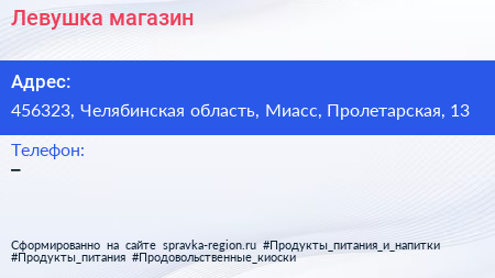 Левушка, магазин по адресу 456323, Челябинская область, Миасс, Пролетарская, 13 в дальнейшем Организация, размещена в следующих категориях: