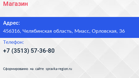 Магазин по адресу 456316, Челябинская область, Миасс, Орловская, 36 в дальнейшем Организация, размещена в следующих категориях: