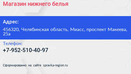 Магазин нижнего белья по адресу 456320, Челябинская область, Миасс, проспект Макеева, 25а в дальнейшем Организация, размещена в следующих категориях: