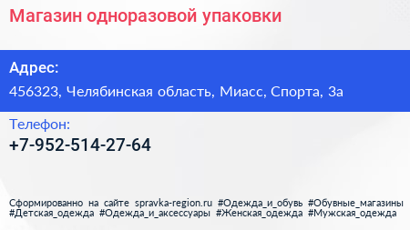 Магазин одноразовой упаковки по адресу 456323, Челябинская область, Миасс, Спорта, 3а в дальнейшем Организация, размещена в следующих категориях: