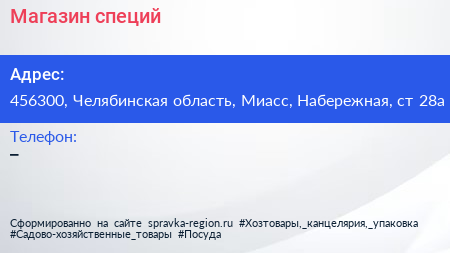 Магазин специй по адресу 456300, Челябинская область, Миасс, Набережная, ст 28а в дальнейшем Организация, размещена в следующих категориях: