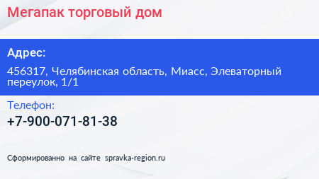Мегапак, торговый дом по адресу 456317, Челябинская область, Миасс, Элеваторный переулок, 1/1 в дальнейшем Организация, размещена в следующих категориях:
