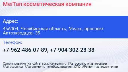 MeiTan, косметическая компания по адресу 456304, Челябинская область, Миасс, проспект Автозаводцев, 35 в дальнейшем Организация, размещена в следующих категориях: