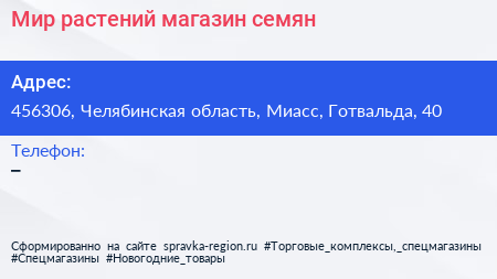 Мир растений, магазин семян по адресу 456306, Челябинская область, Миасс, Готвальда, 40 в дальнейшем Организация, размещена в следующих категориях: